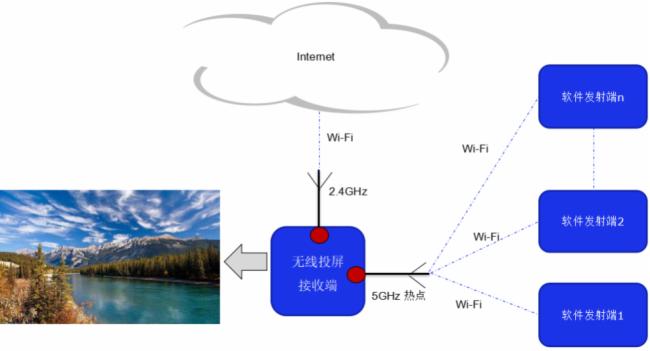 圖2表達的是軟件發送端連接本地局域網,局域網通過無線投屏接收端的2.4GHz網絡連接接收端。所以發送端是通過局域網路由器,然后再連接接收端投屏。這樣的網絡拓撲結構,出問題的概率非常高。具體如下: