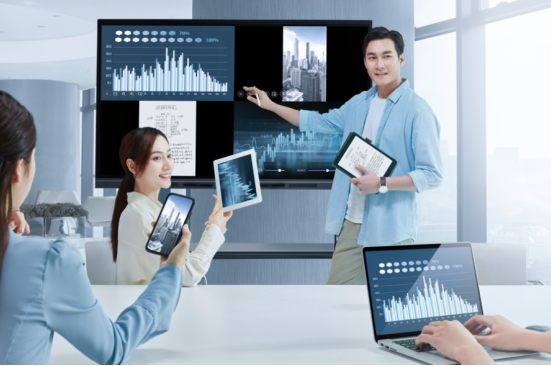 帶有觸摸功能的會議一體機和教學一體機成為會議室主流的顯示屏幕,當帶有觸摸功能的顯示屏幕與無線投屏相結合,我們在進行會議分享演示的時候,可以直接在大屏幕上操作手機、平板、電腦等辦公設備,讓會議直接進入多屏互動模式。