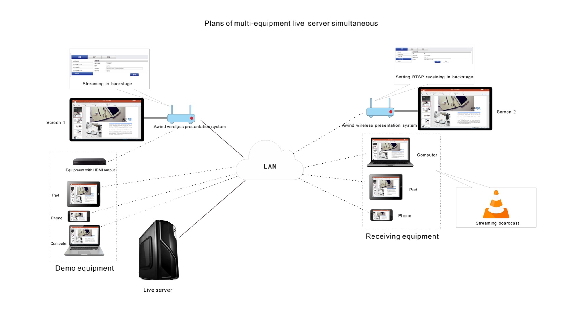 功能實現:該方案可實現演示大屏內容與局域網內各大屏和智能端設備(電腦,手機,平板)同顯,數量可達100。